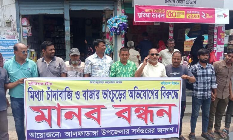 আলফাডাঙ্গায় বাজার ভাংচুর ও মিথ্যা চাঁদাবাজির অভিযোগের বিরুদ্ধে মানব বন্ধন