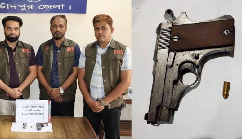 চাঁদপুর ডিবি পুলিশের অভিযানে অবৈধ ০১টি ম্যাগাজিন ও ০১ রাউন্ড গুলি’সহ বিদেশী পিস্তল উদ্ধার