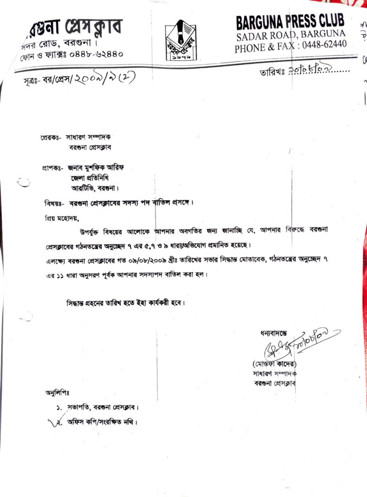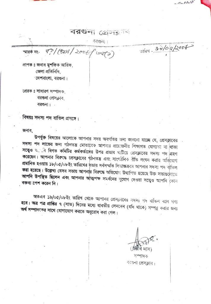 মুশফিক আরিফ এবং হারুন অর রশিদ রিংকু নামের দুই জন সদস্য পদ পাওয়ার জন্য আবেদন করেছিলেন বরগুনা প্রেসক্লাব বরাবর এবং তাদের আবেদন সাংগঠনিক নিয়মে ২০০৭ সালের ১৩ জুলাই বাতিল হয়ে যায়। তৎকালীন সময় বাংলাদেশে সেনা সমর্থিত সরকারের বরগুনার দায়িত্বে থাকা একজন সেনা কর্মকর্তাকে ভুল বুঝিয়ে তার প্রভাব খাটিয়ে ২০০৭ সালের ১৯ জুলাই গঠনতন্ত্র উপেক্ষা করে ভয়-ভীতি দেখিয়ে জোরপূর্বক বরগুনা প্রেসক্লাব এর সদস্য পদ বাগিয়ে নেন তারা। তখন মুশফিক আরিফ কাজ করতেন দেশ বাংলা নামের একটি পত্রিকায়। তখন তার শিক্ষাগত যোগ্যতা ছিল শুধুমাত্র এসএসসি পাস। এরপর ২০০৮ সালে আওয়ামীলীগ ক্ষমতায় আসলে বাঁধে বিপত্তি। অপরাধ বিচিত্রার হাতে আসা কিছু ডকুমেন্টে দেখা যায় ২০০৮ সালের ১৫ই এপ্রিল অ্যাড. সঞ্জিব দাস স্বাক্ষরিত বরগুনা প্রেসক্লাব এর সাধারন সম্পাদক ও সভাপতি বরাবর একটি অভিযোগ দাখিল করা হয়। যেখানে উল্লেখ করা হয় মুশফিক আরিফ ও হারুন অর রশিদ রিংকুকে সদস্য পদ প্রদান এর অনিয়ম প্রসঙ্গে।সদস্য পদ বাতিল প্রসঙ্গে আরেকটি ডকুমেন্টে দেখা যায় মুশফিক আরিফের শিক্ষাগত যোগ্যতা না থাকা এবং ২০০৭ সালের তৎকালীন বরগুনা প্রেসক্লাবের কমিটির উপর প্রভাব খাটিয়ে বরগুনা প্রেসক্লাবের সদস্য পদ নেয়ার কারনে ২০০৮ সালের ১৮ই মে তারিখের এক সভায় তার সদস্য পদ বাতিল করে বরগুনা প্রেসক্লাব। তবে স্থানীয় অনেকে বলেন সেদিন এক প্রকার অস্ত্র ঠেকিয়ে সদস্য পদ নিয়েছিলেন এই মুশফিক আরিফ। ২০০৮ সালের আরেকটি ডকুমেন্টে দেখা যায় তখনকার সভাপতি আনোয়ার হোসেন মনোয়ার এবং সাধারন সম্পাদক গোলাম মোস্তফা কাদের বরগুনা প্রেসক্লাব সভাপতি ও সম্পাদক বরাবরে ২০০৮ সালের ২২ এপ্রিল একটি ডকুমেন্ট সাবমিট করে। সেখানে উল্লেখ করা হয় ২০০৭ সালে প্রচন্ড মানসিক চাপের মুখে ফেলে সাংগঠনিক রীতি লঙ্ঘন করে সদস্য পদ নিয়েছিলেন মুশফিক আরিফ এবং রিংকু। মুশফিক আরিফের সেই ভিডিও এবং পরবর্তী রিপোর্ট দেখতে অপরাধ বিচিত্রার সাথেই থাকুন।