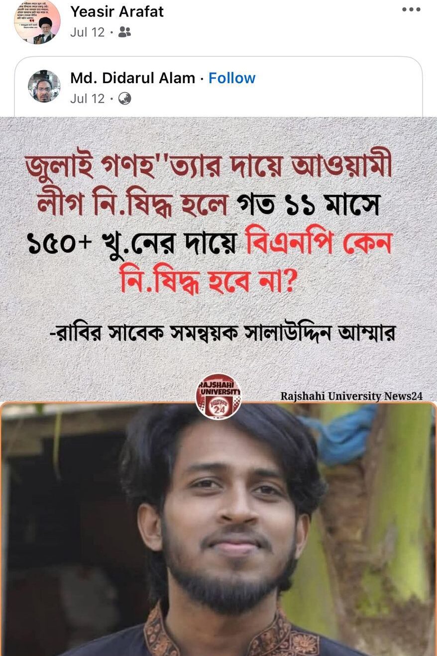 এই ইয়াছের আরাফাত ৫ই আগস্ট এর পর জুলাই হত্যাকাণ্ডে বিএনপিকে নিষিদ্ধ করার জন্য ফেসবুকে স্ট্যাটাস দিয়েছেন, এনসিপিকে সমর্থন ফেসবুকে স্ট্যাটাসও দিয়েছে, বিএনপিকে নিষিদ্ধ করার দাবি করা ব্যক্তি এখন গিয়ে পরিষদের পাল্টা কমিটির সভাপতি প্রার্থী।