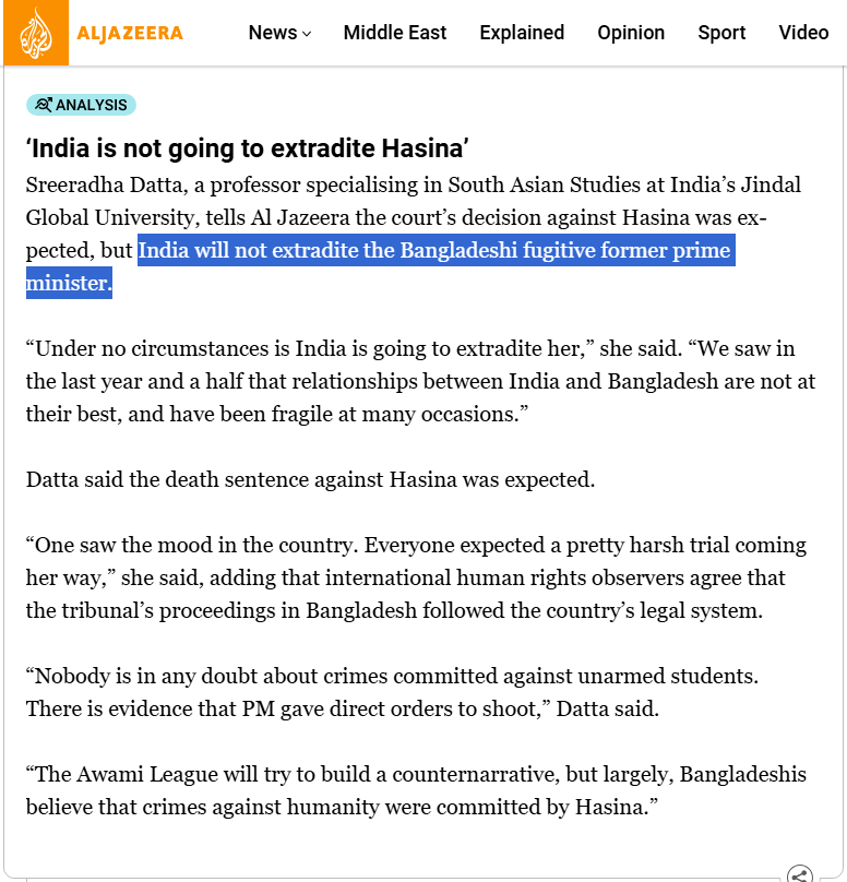 আল জাজিরা সংবাদমাধ্যমকে দেওয়া সাক্ষাৎকারে ভারতের জিন্দাল গ্লোবাল ইউনিভার্সিটির দক্ষিণ এশীয় স্টাডিজের বিশেষজ্ঞ অধ্যাপক শ্রীরাধা দত্ত স্পষ্ট করে জানিয়েছেন, কোনো অবস্থাতেই ভারত তাকে (শেখ হাসিনা) প্রত্যর্পণ করবে না।