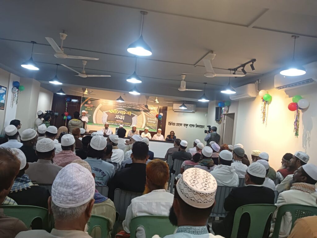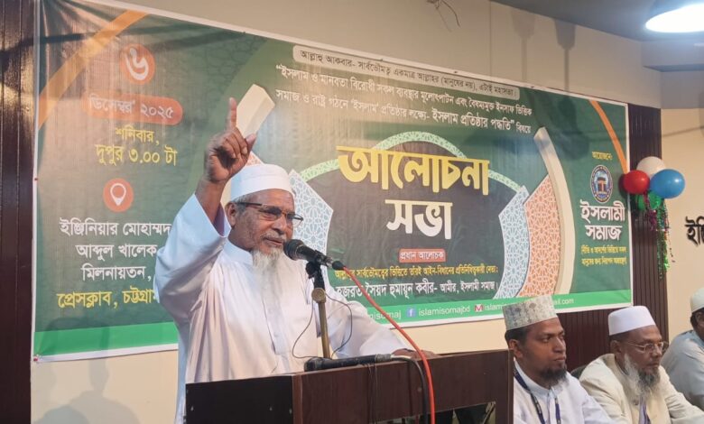 শনিবার বিকেল ৩টায় চট্টগ্রাম প্রেসক্লাবের ইঞ্জিনিয়ার মোহাম্মদ আব্দুল খালেক মিলনায়তনে “ইসলাম ও মানবতা বিরোধী সকল ব্যবস্থার মূলোৎপাটন এবং বৈষম্যমুক্ত ইনসাফ ভিত্তিক সমাজ-রাষ্ট্র গঠনে ইসলাম প্রতিষ্ঠার পদ্ধতি” শীর্ষক আলোচনা সভাটি অনুষ্ঠিত হয়। সভার সভাপতিত্ব করেন চট্টগ্রাম জেলার দায়িত্বশীল মোঃ জামাল উদ্দিন।আমীর হুমায়ূন কবীর বলেন, ইসলাম প্রতিষ্ঠার পথ হলো ঈমান ও ইসলামের দাওয়াতের মাধ্যমে দাওয়াত কবুলকারীদের নিয়ে সমাজ গঠন আন্দোলন। তিনি দাবি করেন, রাসূল (সা.)এর মক্কা থেকে মদিনা পর্যন্ত আন্দোলন ছিল ধৈর্য, দাওয়াত ও নেতৃত্বের আনুগত্যে ঐক্যবদ্ধ সমাজ গঠনের ধারাবাহিকতা,যেখান থেকে শেষে আল্লাহর পক্ষ থেকেই রাষ্ট্রীয় নেতৃত্ব প্রদান করা হয়েছিল।তিনি আরও বলেন, রাষ্ট্রীয় নেতৃত্ব লাভের পরই সমাজ ও রাষ্ট্রে ইসলামবিরোধী আইন অপসারণ এবং প্রয়োজনীয় সময়ে সশস্ত্র লড়াই বৈধ হয়েছিল। রাষ্ট্রীয় নেতৃত্বের আগেই এ ধরনের পদক্ষেপের অনুমোদন নেই বলেও মন্তব্য করেন তিনি।