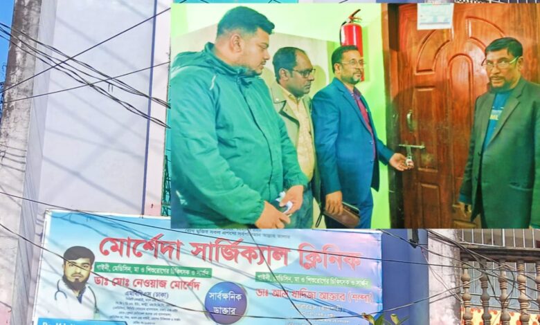 নড়াইলের লোহাগড়া উপজেলায় রোগীর পেটে গজ কাপড় রেখে সেলাই দেয়ার অভিযোগে মোর্শেদা সার্জিকাল ক্লিনিকের অপারেশন থিয়েটার সিলগালাসহ ক্লিনিকের সকল কার্যক্রম পরবর্তী নির্দেশ না দেয়া পর্যন্ত বন্ধ রাখার নির্দেশ দিয়েছে লোহাগড়া উপজেলা স্বাস্থ্য বিভাগ। উজ্জ্বল রায়, নড়াইল থেকে জানান, বুধবার (১০ ডিসেম্বর) বেলা ১১ টায় সিএন্ডবি চৌরস্তায় অবস্থিত মোরশেদা সার্জিক্যাল ক্লিনিক এ অভিযান চালায় লোহাগড়া উপজেলা স্বাস্থ্য বিভাগ।