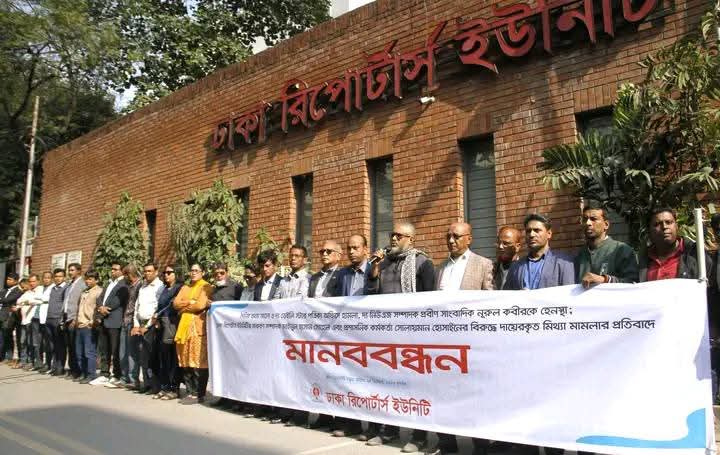 বুধবার (২৪ ডিসেম্বর) দুপুরে ঢাকা রিপোর্টার্স ইউনিটি চত্বরে এ মানববন্ধন অনুষ্ঠিত হয়। এতে ডিআরইউ সভাপতি আবু সালেহ আকনের সভাপতিত্বে এবং সাধারণ সম্পাদক মাইনুল হাসান সোহেলের সঞ্চালনায় ডিআরইউর নেতৃবৃন্দসহ গণমাধ্যমের সিনিয়র সাংবাদিকরা অংশ নেন।