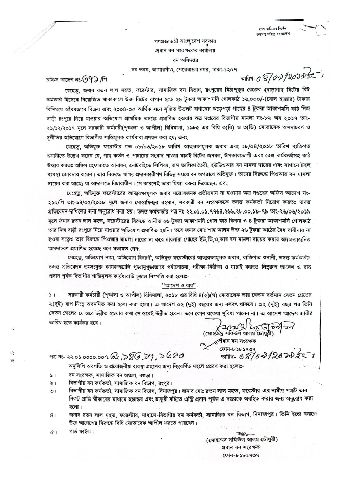 এর আগেও রংপুর বন বিভাগে কর্মরত অবস্থায় তার বিরুদ্ধে অনিয়ম, দূর্নীতি ও ক্ষমতার অপব্যবহারের অভিযোগ উঠে। সে সময় বিভাগীয় মামলায় তাকে সাময়িক বহিষ্কারসহ শাস্তির মুখোমুখি হন।