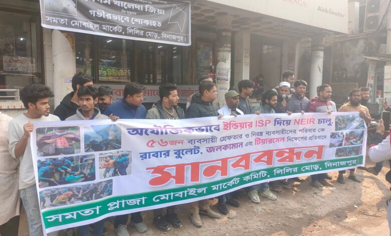 ভারতের আইএসপি (ISP) ব্যবহার করে এনআইইআর (NIER) চালুর অভিযোগে অযৌক্তিকভাবে ৫৬ জন ব্যবসায়ীকে গ্রেফতারের প্রতিবাদে মানববন্ধন করেছে দিনাজপুর  সমতা প্লাজা মোবাইল মার্কেট ব্যবসায়ী  কমিটি। একই সঙ্গে নিরস্ত্র ব্যবসায়ীদের পরিবারের ওপর রাবার বুলেট, জলকামান ও টিয়ারশেল নিক্ষেপের ঘটনার তীব্র নিন্দা ও প্রতিবাদ জানানো হয়।
