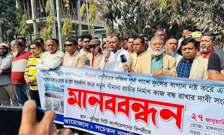 মানববন্ধনে বক্তারা অভিযোগ করে বলেন,সড়ক ও ফুটপাত দখল করে নতুন করে একটি প্রাচীর নির্মাণ করা হচ্ছে, যা জনসাধারণের চলাচলে মারাত্মক বিঘ্ন সৃষ্টি করছে।এ ধরনের দখলদারিত্ব নগর পরিকল্পনার পরিপন্থী এবং জনস্বার্থবিরোধী বলেও মন্তব্য করেন তারা। বক্তারা জানান,অবিলম্বে এ নির্মাণকাজ বন্ধ করে আগামী ৭২ ঘণ্টার মধ্যে উক্ত প্রাচীর অপসারণের জন্য সংশ্লিষ্ট কর্তৃপক্ষের প্রতি জোরালো দাবি জানানো হচ্ছে।