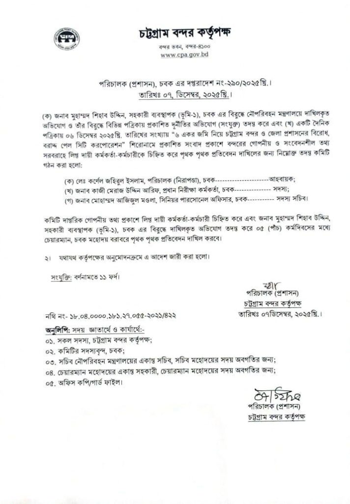 পরবর্তী সময়ে ২৫ নভেম্বর মন্ত্রণালয়ের চবক শাখার উপসচিব কাজী মোহাম্মদ চাহেল তস্তরী স্বাক্ষরিত পত্রে বন্দর চেয়ারম্যানকে অভিযোগটি তদন্তপূর্বক প্রতিবেদন দাখিলের নির্দেশ দেওয়া হয়। পত্রটি চট্টগ্রাম বন্দর কর্তৃপক্ষের প্রশাসন বিভাগে স্মারক নং-২৮৭৬ এবং চেয়ারম্যানের দপ্তরে স্মারক নং-৯৭০ হিসেবে গৃহীত হয়, মূল পত্রের স্মারক নম্বর ছিল ৩৯০—অর্থাৎ নথিপত্রে দ্রুত অগ্রগতির স্পষ্ট চিহ্ন থাকলেও মাঠপর্যায়ে তদন্ত কার্যক্রমের দৃশ্যমান অগ্রগতি নেই বলেই সংশ্লিষ্ট সূত্রগুলো জানিয়েছে।