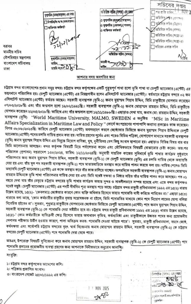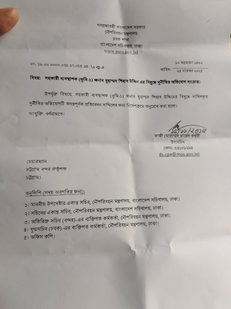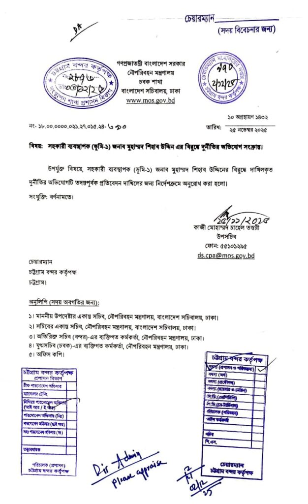 চট্টগ্রাম প্রতিনিধিঃ দুর্নীতির অভিযোগে অভিযুক্ত চট্টগ্রাম বন্দরের সহকারী ব্যবস্থাপক (ভূমি-১) মুহাম্মদ শিহাব উদ্দিনের বিরুদ্ধে তদন্ত করে প্রতিবেদন দাখিলের নির্দেশ দিয়েছিল নৌপরিবহন মন্ত্রণালয়, কিন্তু নির্দেশ জারির দীর্ঘ সময় পেরিয়ে গেলেও দৃশ্যমান কোনো তদন্ত অগ্রগতি না থাকায় দেশের প্রধান সমুদ্রবন্দরের প্রশাসনিক জবাবদিহি নিয়ে নতুন করে প্রশ্ন উঠেছে।