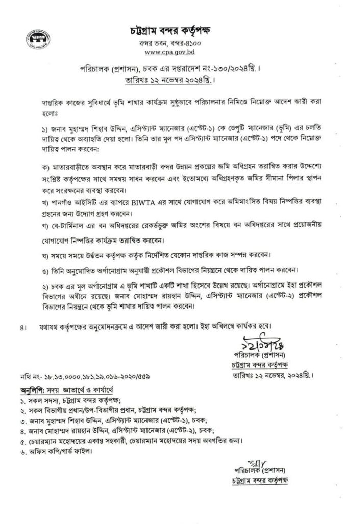 এদিকে চট্টগ্রাম বন্দর কর্তৃপক্ষের পরিচালক (প্রশাসন) স্বাক্ষরিত দপ্তরাদেশ নং-১৩০/২৪ অনুযায়ী শিহাব উদ্দিনকে ডেপুটি ম্যানেজার (ভূমি) পদে চলতি দায়িত্ব থেকে অব্যাহতি দিয়ে নিজ পদ সহকারী ব্যবস্থাপক (এস্টেট-১) হিসেবে দায়িত্ব পালনের নির্দেশ দেওয়া হয়।
