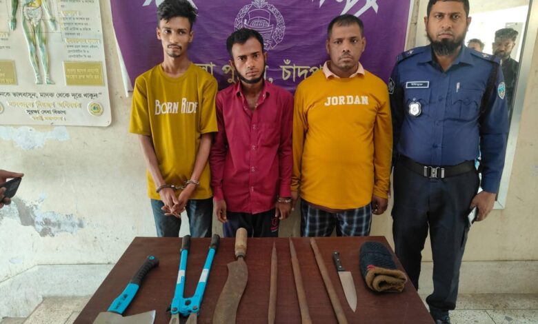 আটককৃতরা হলেন— মো. জাহেদ ওরফে জাহিদ (২৭), বাড়ি লক্ষ্মীপুর জেলার রামগঞ্জ উপজেলায়; মো. ইসমাইল হোসেন (৩৫), কুমিল্লার মুরাদনগর উপজেলার বাসিন্দা; এবং মো. মহসীন মিয়া (৪০), কুমিল্লার দাউদকান্দি উপজেলার বাসিন্দা।