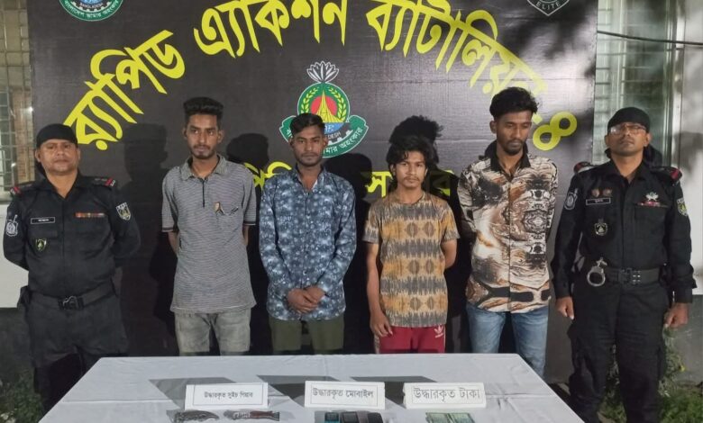সাভারে র্যাব-৪ এর অভিযানে অস্ত্র ও নগদ টাকাসহ চার ছিনতাইকারীকে গ্রেফতার