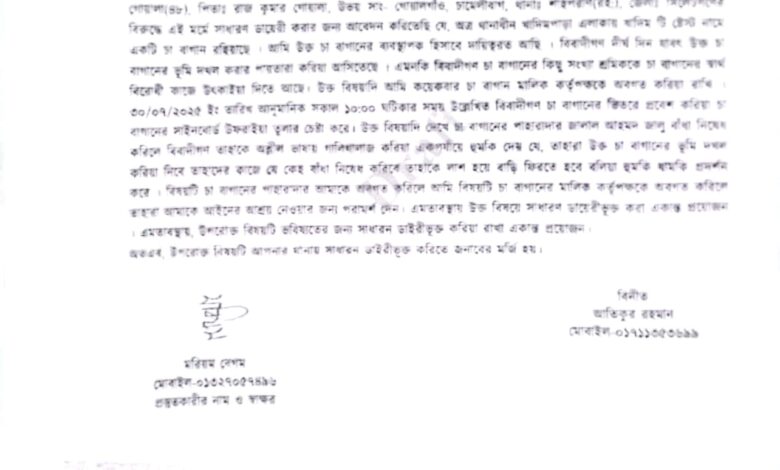 Read More »নিজস্ব প্রতিবেদক: সিলেটের সদর উপজেলাধীন শাহপরান (রহ:) থানার অর্ন্তগত খাদিম পাড়া এলাকায় খাদিম টি ষ্টেস্ট চা বাগানের জমি দখল করতে…