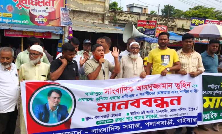 Read More »আশরাফুজ্জামান সরকার, গাইবান্ধা প্রতিনিধি: গাজীপুরের সাংবাদিক আসাদুজ্জামান তুহিন হত্যার প্রতিবাদ এবং দোষীদের দৃষ্টান্তমূলক শাস্তির দাবিতে গাইবান্ধার পলাশবাড়ীতে মানববন্ধন করেছেন স্থানীয়…