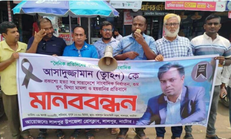 Read More »এস ইসলাম, লালপুর ( নাটোর) প্রতিনিধি : গাজীপুরে দৈনিক প্রতিদিনের কাগজের স্টাফ রিপোর্টার মো. আসাদুজ্জামান তুহিনকে কুপিয়ে হত্যার প্রতিবাদে লালপুর…